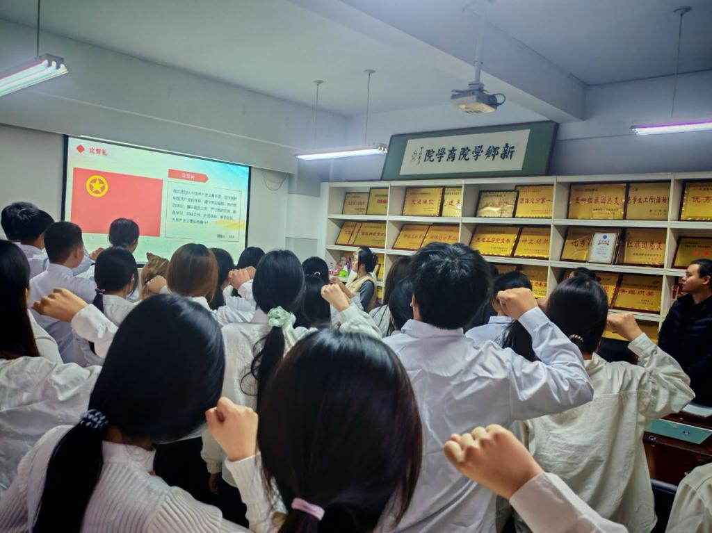 仪式在雄壮的国歌声中启幕。李雅林、李然为新团员佩戴团徽。这枚徽章既是团员身份象征,更是践行 “精诚博学、弘商求实” 院训的责任印记。新团员庄严宣誓,尽显投身共青团事业、助力经济发展的决心。