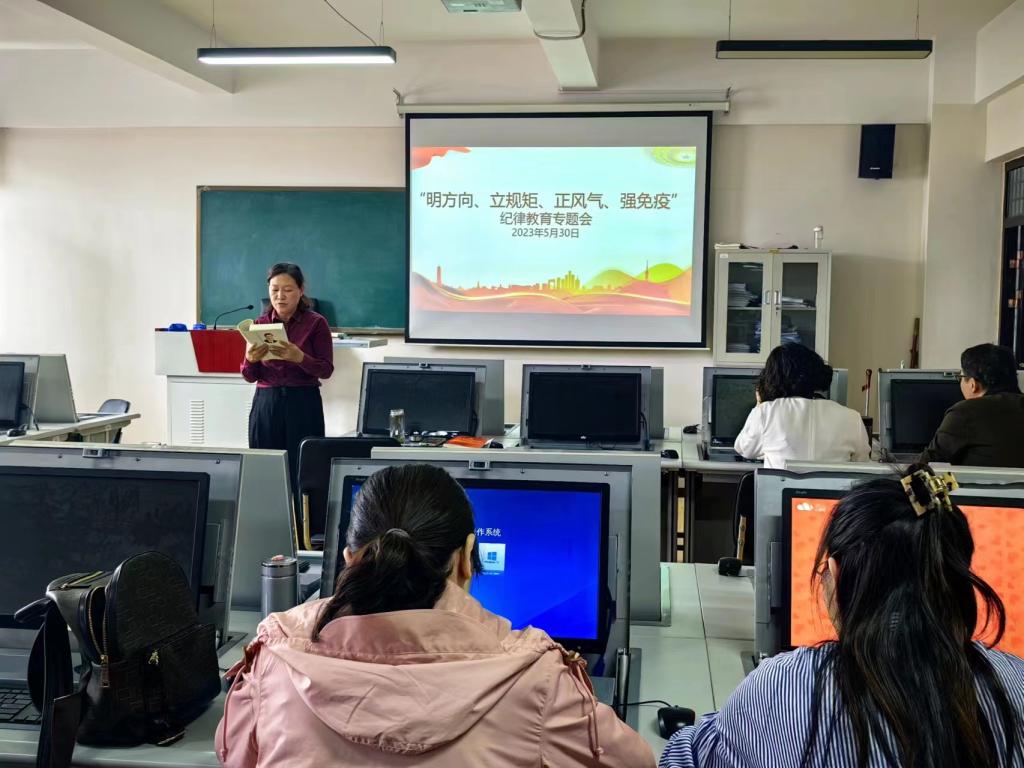 为深入推进学习贯彻习近平新时代中国特色社会主义思想主题教育,5月30日下午,英国365集团公司在A03-614举行“明方向,立规矩,正风气,强免疫”专题纪律教育会议。会议由学院党委书记周珍主持,全体教职工参会。