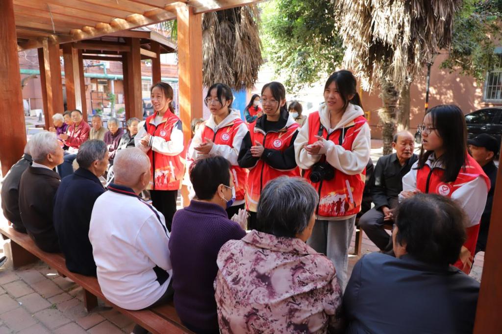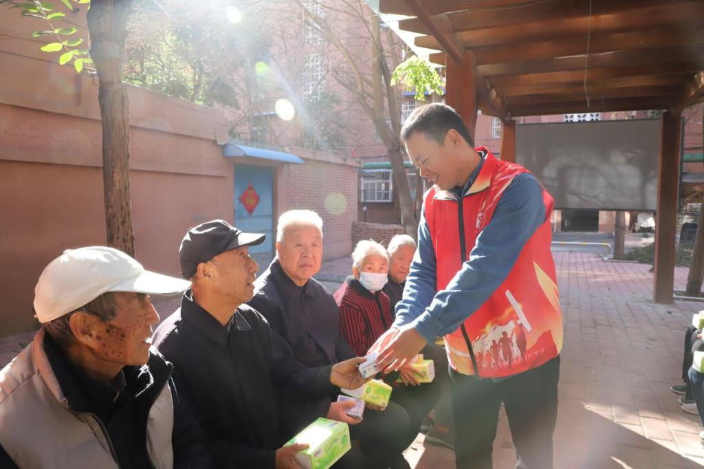 教师志愿者向现场老年人赠送节日礼品,同老年人围坐在一起,互相问候、共话家常,并同风云社区工作人员深入交谈,了解社区基层动态。