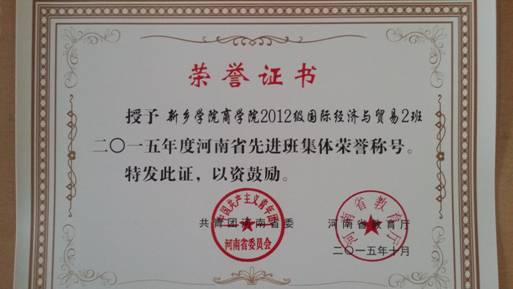 2012级国际经济与贸易2班获得2015年度河南省先进班集体荣誉称号;