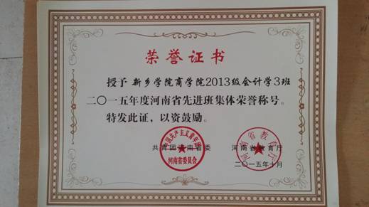 2013级会计学3班获得2015年度河南省先进班集体荣誉称号;