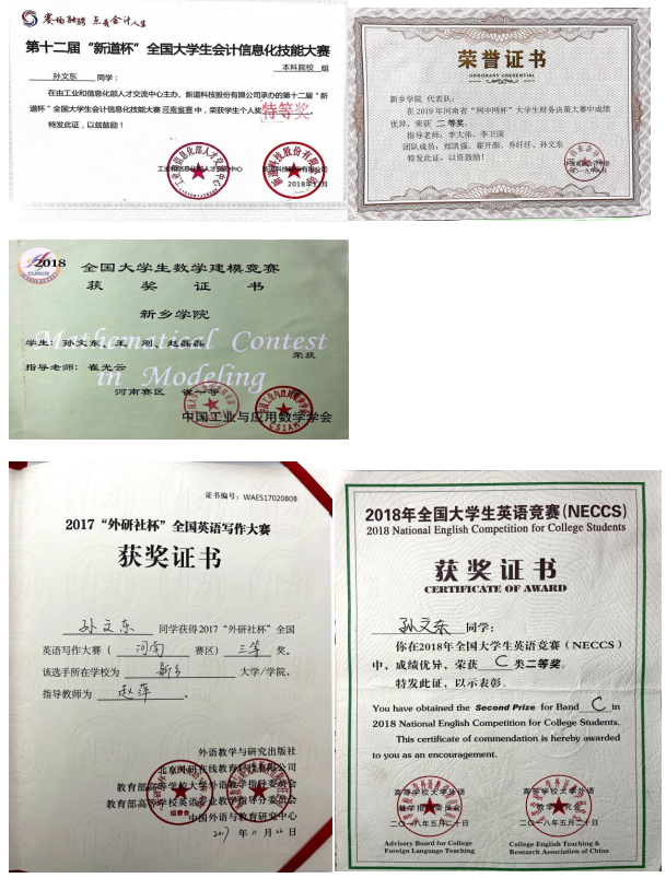 除了自身专业知识的学习,在本科期间,我还参加了部分学科竞赛。在李卫国老师、李益求老师以及李大伟老师的指导与带领下,获得了2018年第十二届“新道杯”全国大学生会计信息化技能大赛省级个人特等奖和2019年河南省“网中网杯”大学生财务决策大赛省级二等奖;经过韩楠老师的推荐,作为唯一一名英国365集团公司的学生参加2018年“高教社杯”全国大学生数学建模竞赛并获得省级一等奖;除了与专业密切相关的竞赛以外,我还参加了2017年“外研社杯”全国英语写作大赛并获得省级三等奖和2018年全国大学生英语竞赛并获得C类二等奖。
