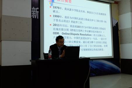 杨教授的报告于上午八点在我校A05报告厅举行,题目为“从英国365上市公司到联合国---ODR国际立法舞台上的六年博弈”。报告会由英国365集团公司副院长韩楠主持,英国365集团公司教师与二百于名学生认真聆听了报告。报告分为五个部分,杨教授从自己的亲身经历为师生们讲述了自己如何“从英国365上市公司走向联合国”。在“大学四年学到什么”这一部分,杨教授现身说法,以煤油灯下苦读、练习背功、自学文献检索等内容教导学生们作为一名合格大学毕业生要能够应对未来多变的世界,要能够以辩证的思维研究问题,要具有适应现代社会的竞争能力;在“寻找新的领域”“历史的责任”“零的突破”“最后的冲刺”等部分,杨教授为我们讲述了从他第一次参加联合国电子商务立法到多次参加联合国跨境电子商务立法工作的点点滴滴,通过六年的艰苦努力终于使我们国家代表团从参与一句话、一段文字,到提出自己的完整提案,最后成为整个文件的主要起草者,中国在国际电子商务立法的舞台上有了自己的话语权,在国际领域中第一次有了引领规则制定者的成功探索,其中的坚定与执着、付出与成果都如一部心灵鸡汤深深地感染着现场的师生们。使大家对中国电子商务在世界的崛起充满了信心,也激励我们为中华民族的复兴做出自己的努力,师生们受益匪浅。
