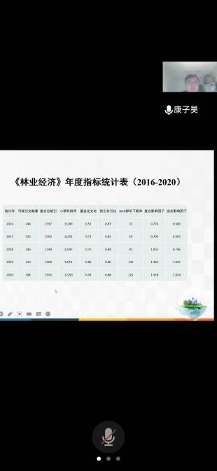 首先,康子昊编辑对《林业经济》主题定位与办刊宗旨进行总体介绍。其次,他从专业编辑视角介绍了《林业经济》期刊的在线办公系统操作指南,《林业经济》的审稿流程,以及投稿文本撰写中应注意的问题。康编辑指出学术性期刊不是政策研究性杂志,平时要关注学术,研究政策影响,论文要从学术的角度进行研究,论文在投稿时要符合学术期刊的标准范式。其次,康编辑在对论文写作的创新部分做介绍时指出论文内容需贴近期刊关注的前沿热点和重要问题,同时要提出的问题及观点应符合国家大政方针。如:减缓气候变化、维护生态安全、促进绿色发展、加快乡村振兴等热点问题。最后,康编辑对老师们提出的论文写作及期刊投稿问题进行了详细的解答。康编辑指出,平时的积累才是关键,并鼓励老师们平时多进行科研创作。