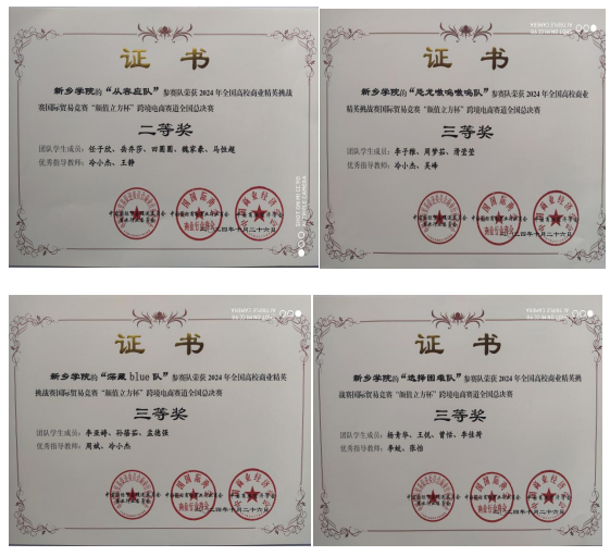 在国际贸易竞赛“颜值立方杯”跨境电商赛道中荣获国家二等奖1项,国家级三等奖3项。其中,“从容应对”小组荣获二等奖(指导老师:冷小杰、王静);“恐龙嗷呜嗷呜队”小组荣获三等奖(指导老师:冷小杰、吴峰);“深藏blue队”小组荣获三等奖(指导老师:周斌、冷小杰);“选择困难队”小组荣获三等奖(指导老师:李蛟、张怡)。