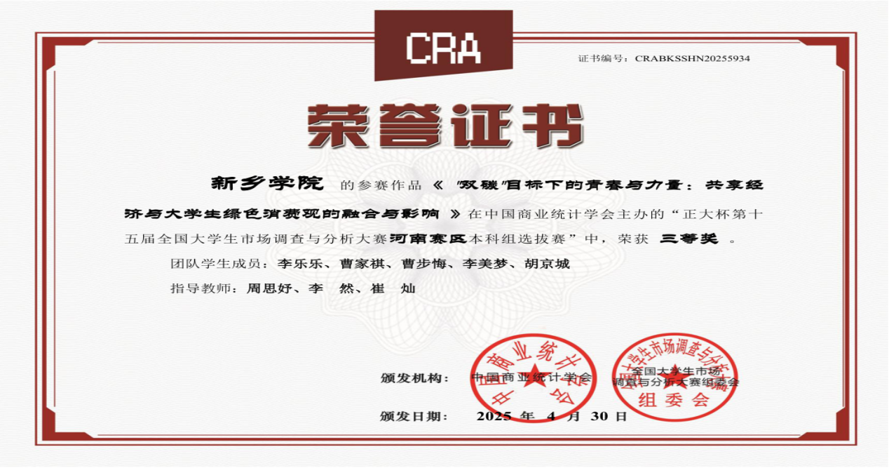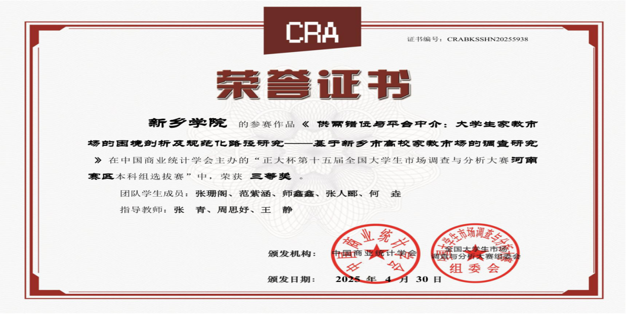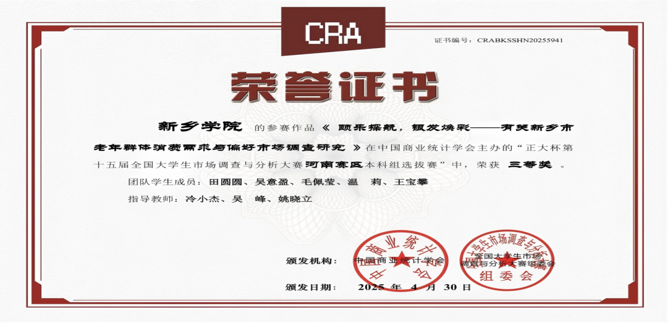 近日,在备受瞩目的第十五届全国大学生市场调查与分析大赛河南赛区本科组选拔赛的激烈角逐中,商学院参赛团队凭借扎实的专业知识、出色的调研能力和创新的思维模式,脱颖而出,荣获省一等奖1项、省三等奖6项,为学院赢得了荣誉,充分展现了商学院在实践教学和人才培养方面的卓越成果。