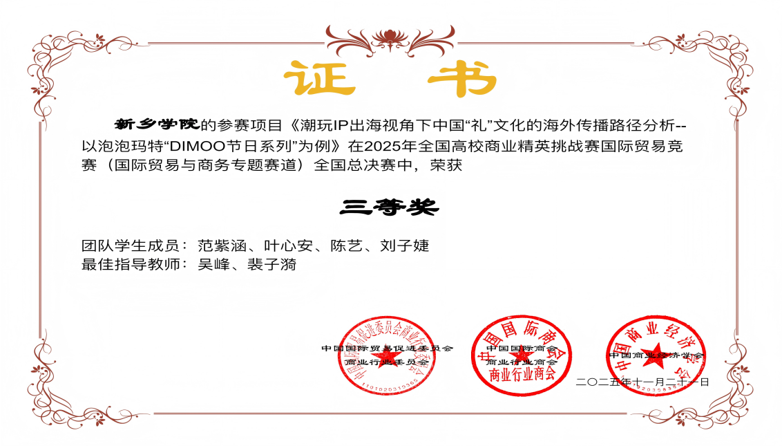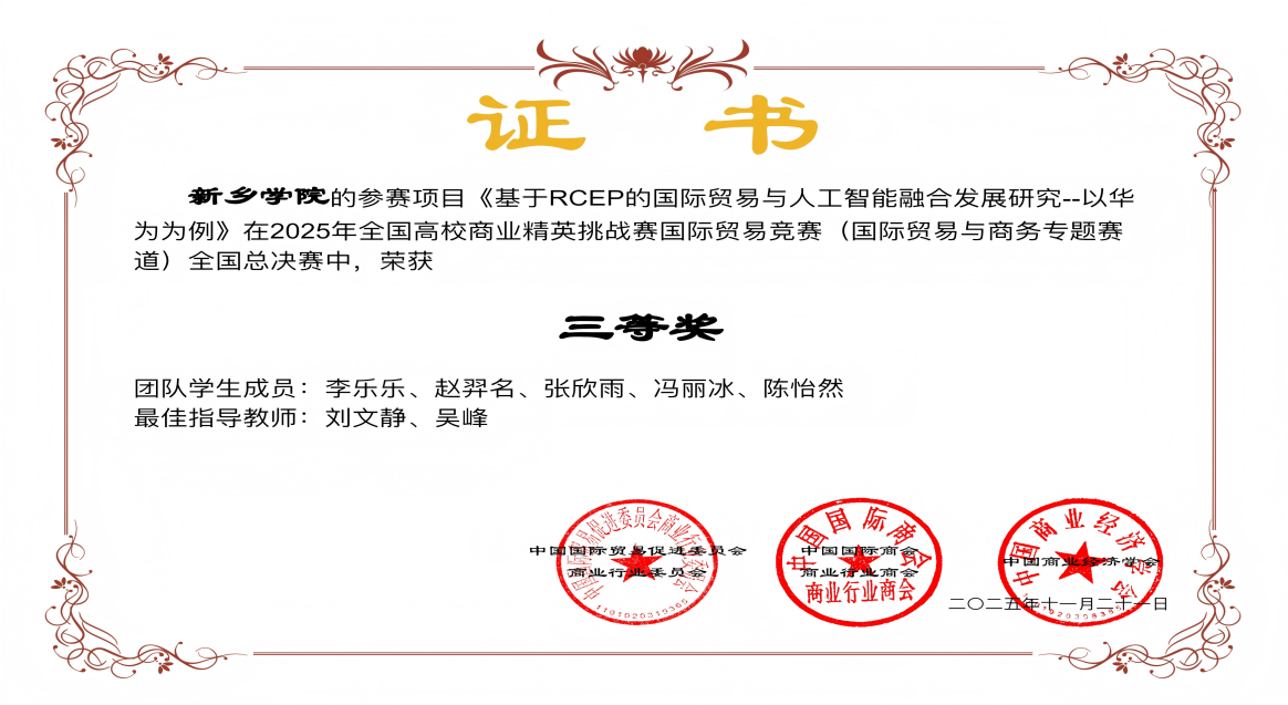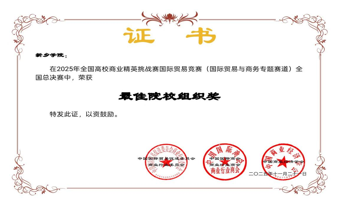 2025年11月,由中国国际贸易促进委员会商业行业委员会、中国国际商会商业行业商会和中国商业经济学会共同主办的2025年全国高校商业精英挑战赛国际贸易竞赛(国际贸易与商务专题赛道)总决赛圆满落幕。我院共有5支队伍入围,经过层层选拔和激烈角逐,最终获得国家二等奖2项,国家三等奖3项,并获评“最佳组织奖”。