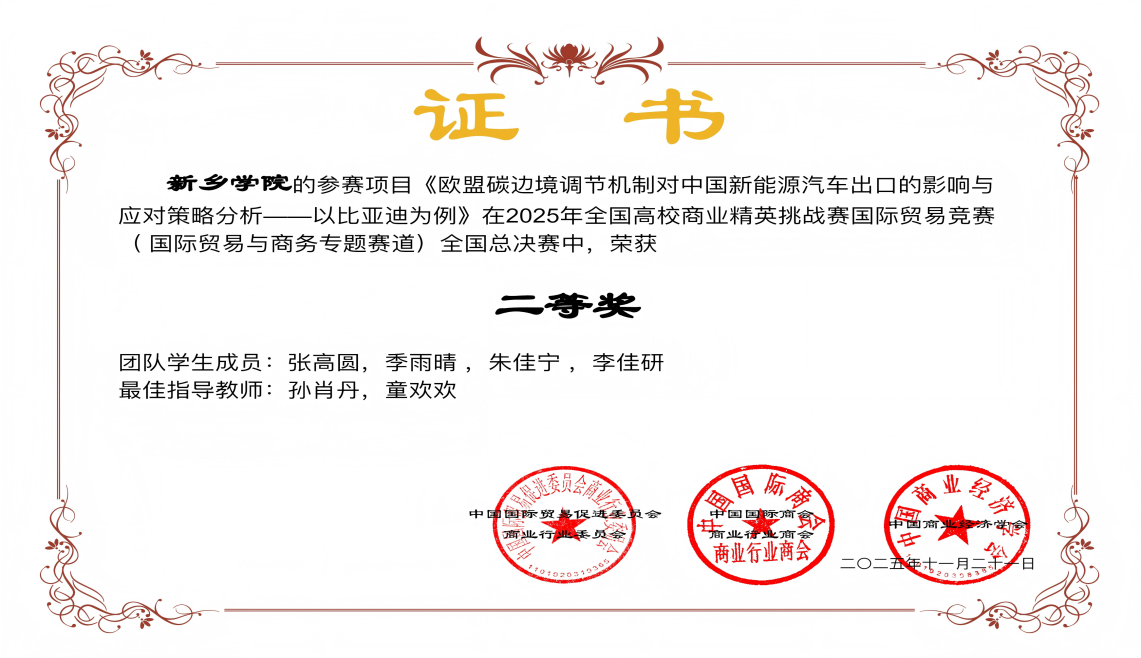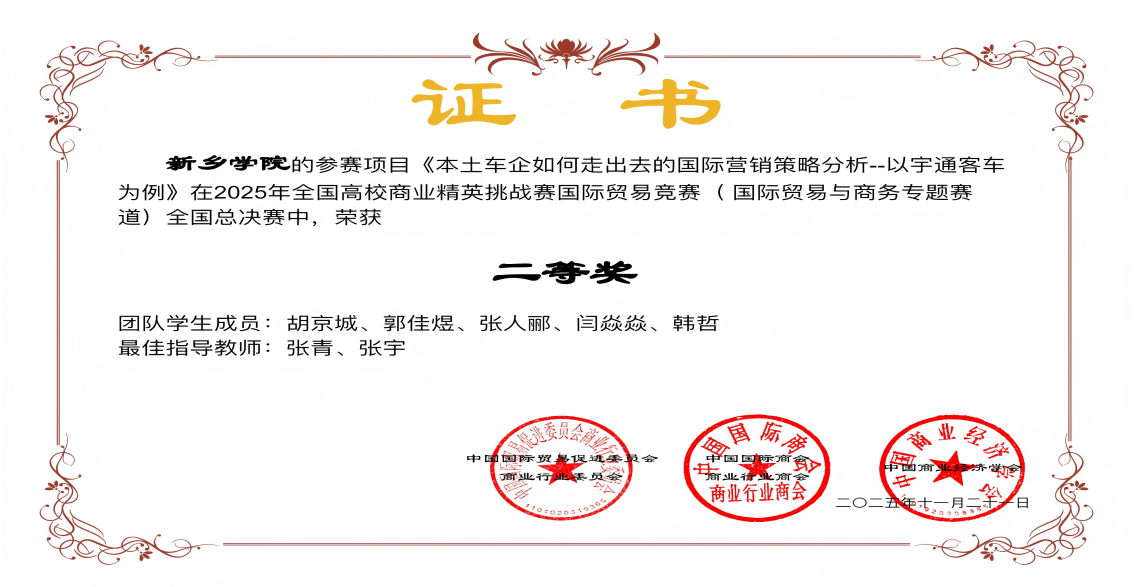 其中,由童欢欢老师指导,张高圆、季雨晴等同学组成的团队以比亚迪为研究案例,启示中国新能源汽车企业需以技术创新为根基,以规则解码为突破口,以生态构建为护城河,实现从“被动应对”到“主动引领”的转变,并凭借作品《欧盟碳边境调节机制对中国新能源汽车出口的影响与应对策略分析—以比亚迪为例》荣获二等奖;由张青、张宇老师指导,胡京城、郭佳煜等同学组成的团队,通过深入分析宇通客车目标市场的经济环境、消费习惯及政策法规,实施“一国一策”的精准化营销,凭借作品《本土车企如何走出去的国际营销策略分析—以宇通客车为例》荣获二等奖。
